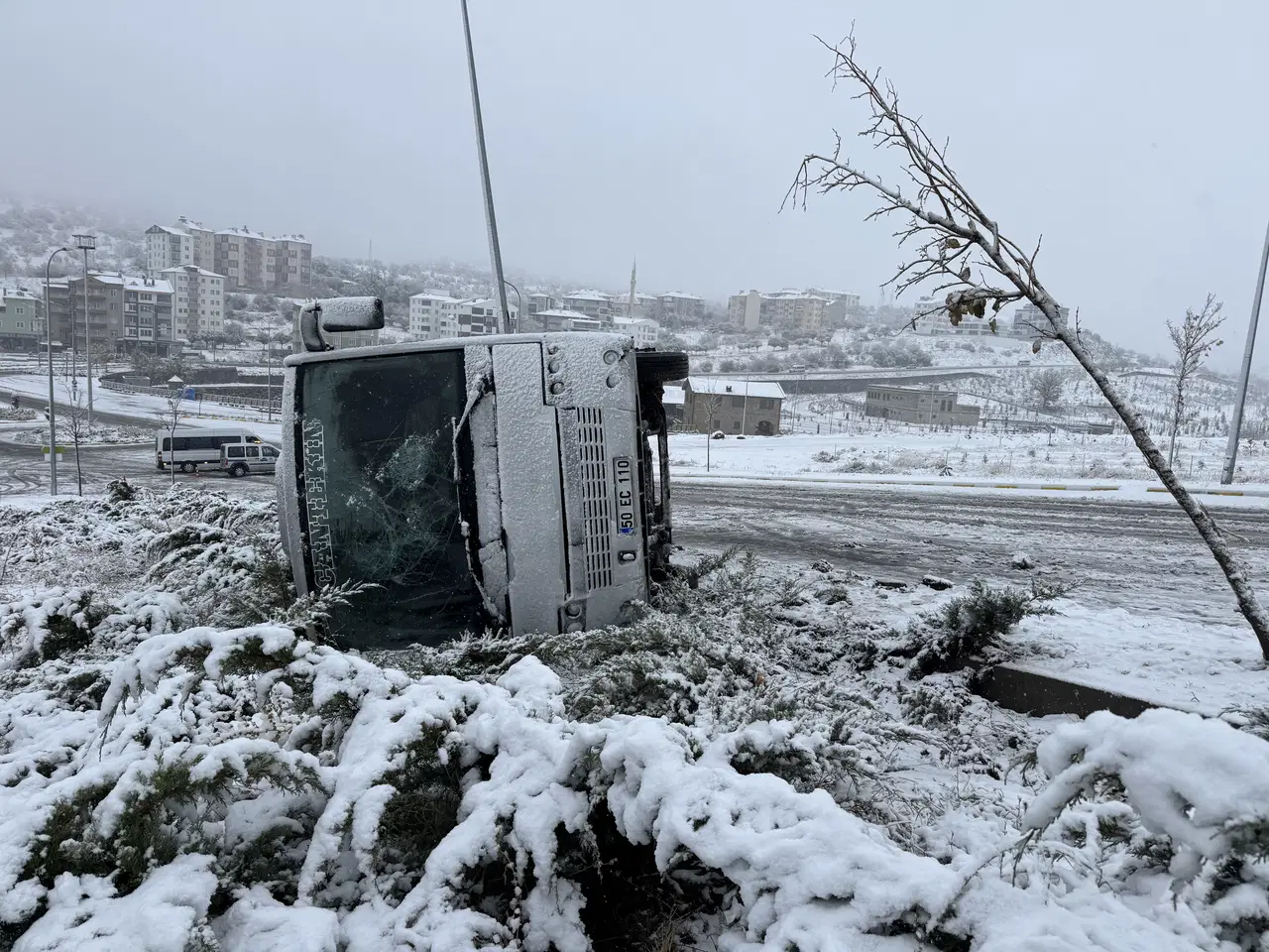 Abdullah Ağmanalmaz idaresindeki 50 EC 110 plakalı minibüs, Yavuz Sultan Selim Mahallesi Kayaşehir yolunda, kar yağışının ardından kayganlaşan yolda refüje çarparak devrildi.