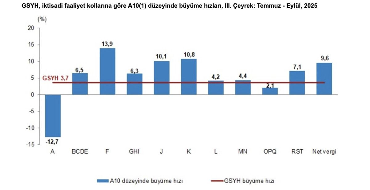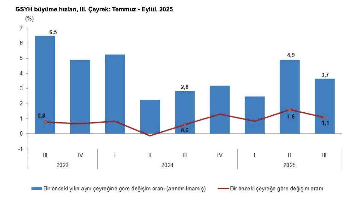 GSYH 2025 yılı üçüncü çeyrek ilk tahmini; zincirlenmiş hacim endeksi olarak, bir önceki yılın aynı çeyreğine göre yüzde 3,7 arttı.